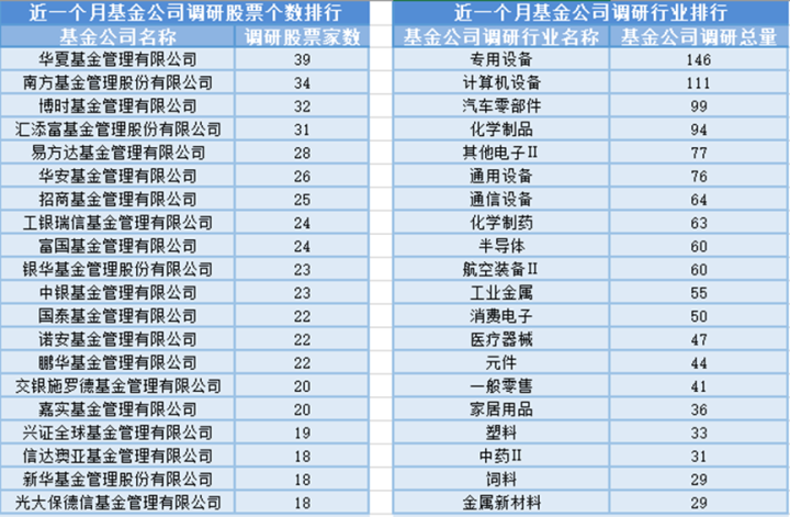 近一个月(11月29日-12月29日),华夏基金参与公司调研的数量最多,共调研39家上市公司,此外调研较为活跃的还有南方基金、博时基金和汇添富基金,分别调研34家、32家、31家上市公司;从调研行业上来看,基金公司对专用设备行业的上市公司调研次数最多,共有146次,其次是计算机设备行业,基金公司调研了111次。