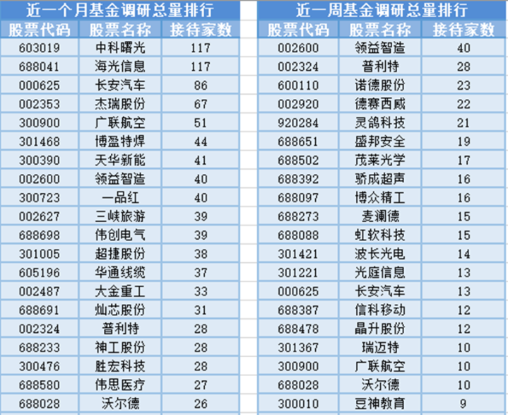 从个股调研情况上来看,最近1个月(11月29日-12月29日)最受公募基金关注的是中科曙光,中科曙光属于专用计算机设备行业,主营业务为高端计算机、存储、安全、数据中心产品的研发及制造,同时大力发展数字基础设施建设、智能计算等业务。共有117家基金管理公司参与调研,其次是海光信息和长安汽车,分别接受117家、86家基金管理公司的调研。